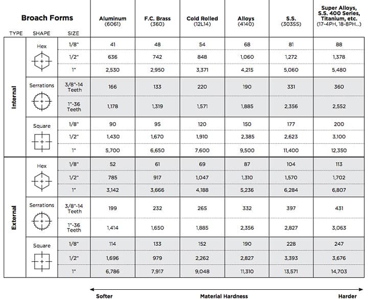 بروچ‌ها اغلب از جنس M-2 High Speed Steel (HSS) ساخته می‌شوند، اما می‌توانند از جنس‌های سخت‌تر مانند M-42، PM T-15 یا PM M-4 HSS نیز ساخته شوند. روکش‌هایی نظیر تیتانیوم نیترید، تیتانیوم کربونیترید و تیتانیوم آلومینیوم نیترید نیز می‌توانند جهت استحکام‌بخشی و افزایش طول عمر ابزار مورد استفاده قرار گیرند.
